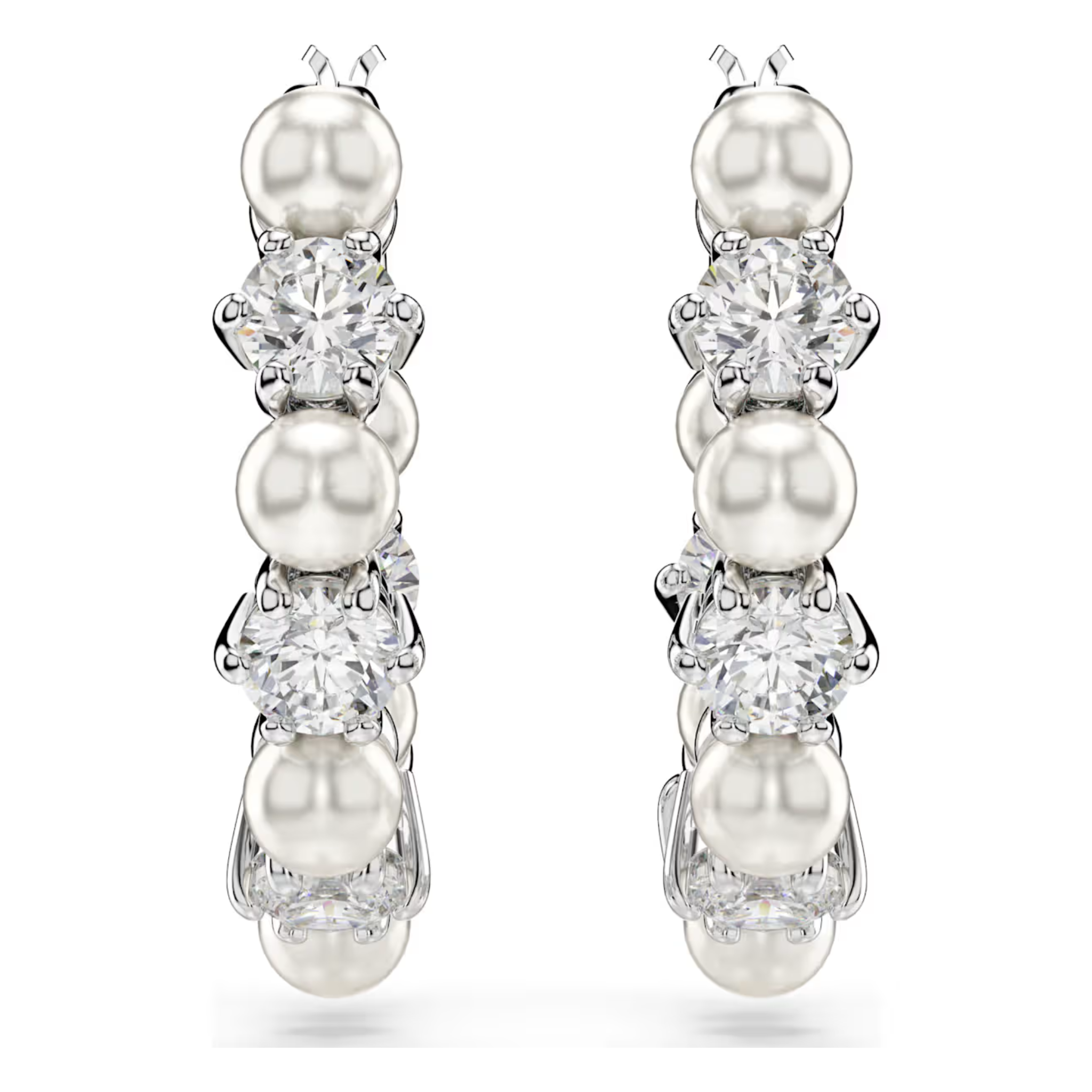 Wyjątkowa, nowoczesna wariacja na temat klasycznego fasonu kolczyków kreoli. Każdy z nich jest pokryty powłoką z rodu i ozdobiony naprzemiennie ułożonymi cyrkoniami Swarovskiego i kryształowymi perłami Swarovskiego.