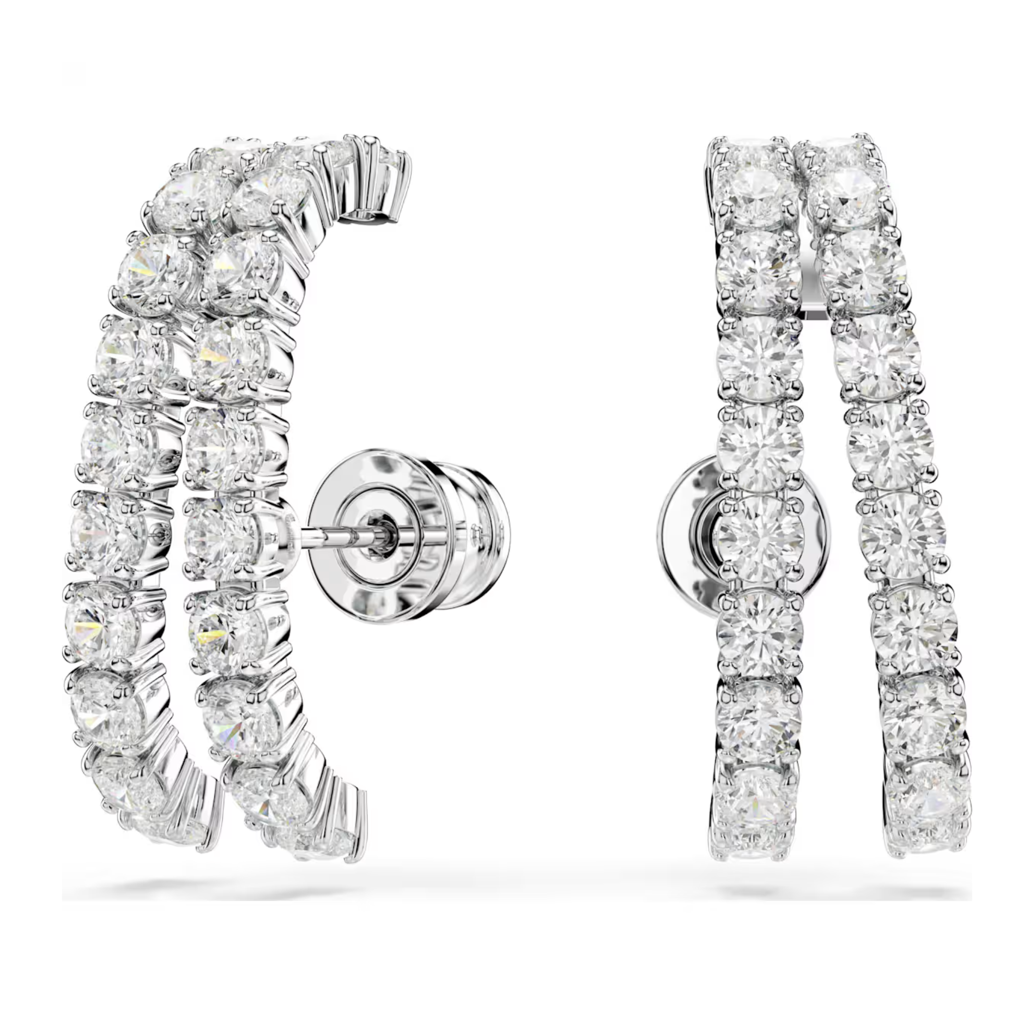 Kolczyki są pokryte powłoką z rodu i ozdobione po zewnętrznej stronie bezbarwnymi cyrkoniami Swarovskiego.