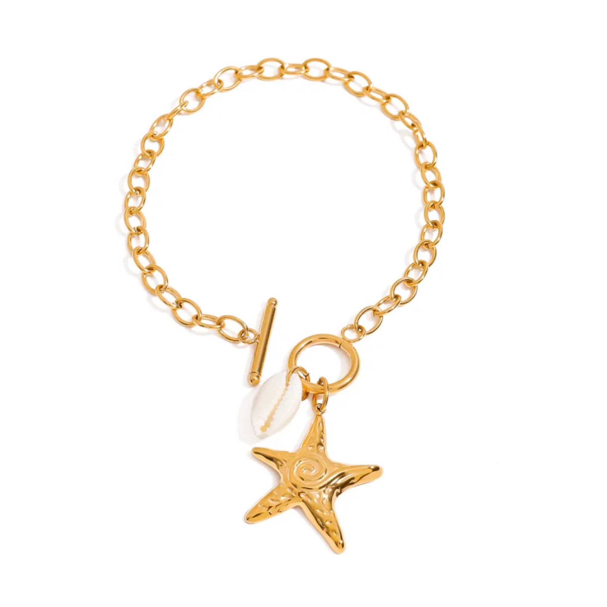 Ozdobiona naturalną muszelką oraz zawieszką w kształcie rozgwiazdy, wprowadza do stylizacji lekkość i słoneczny akcent – idealna do noszenia solo lub w zestawie z innymi złotymi bransoletkami. Delikatna, ale przyciągająca spojrzenia – idealna zarówno na co dzień, jak i do letnich stylizacji z charakterem.