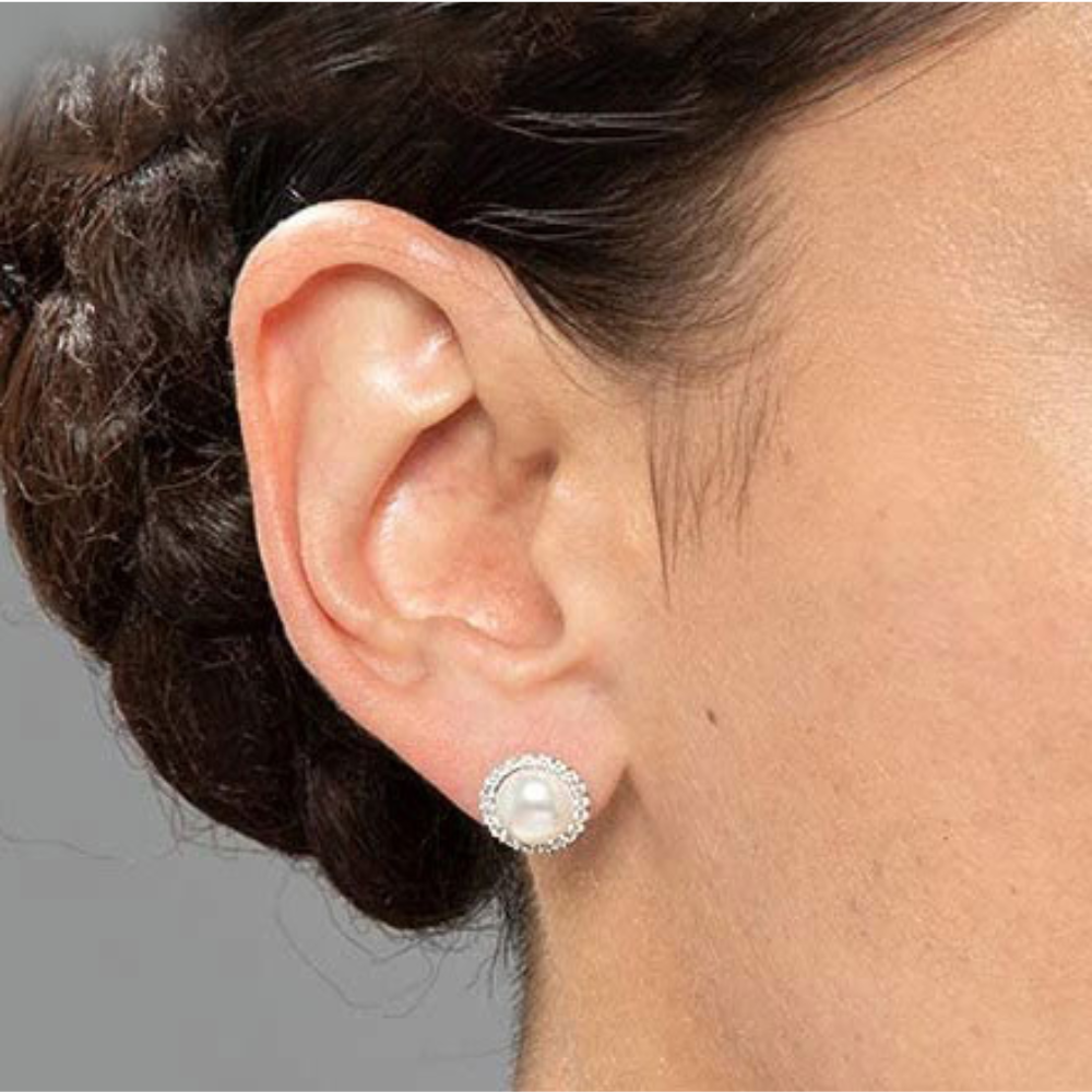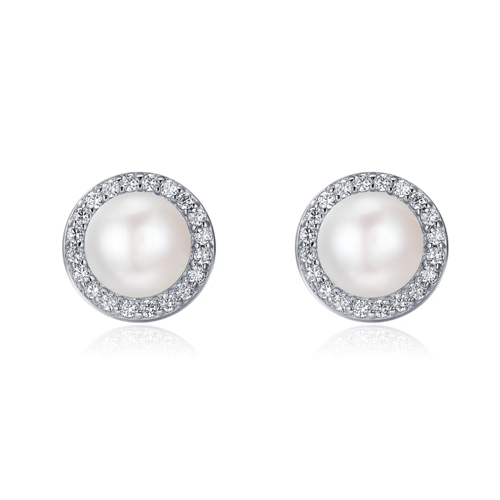 Kolczyki na sztyfcie ozdobione perłami oraz cyrkoniami.