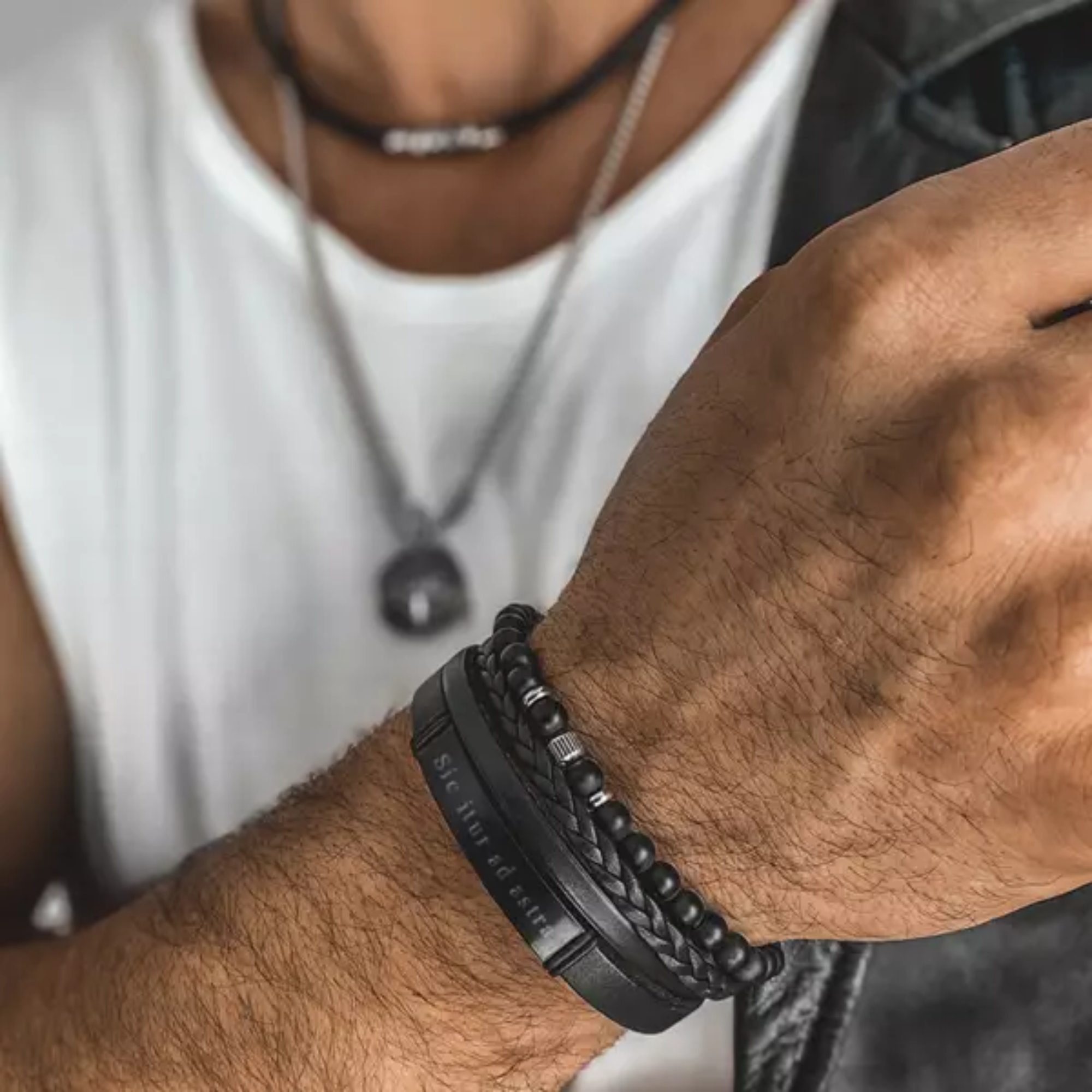Bransoletka męska wykonana z czarnej, naturalnej skóry i antyalergicznej stali szlachetnej w kolorze czarnym z matowym wykończeniem. Stanowi doskonały dodatek nie tylko do codziennego ubioru, ale również koszuli, eleganckiej marynarki czy garnituru. Bransoletka posiada dyskretne zapięcie w kolorze czarnym.