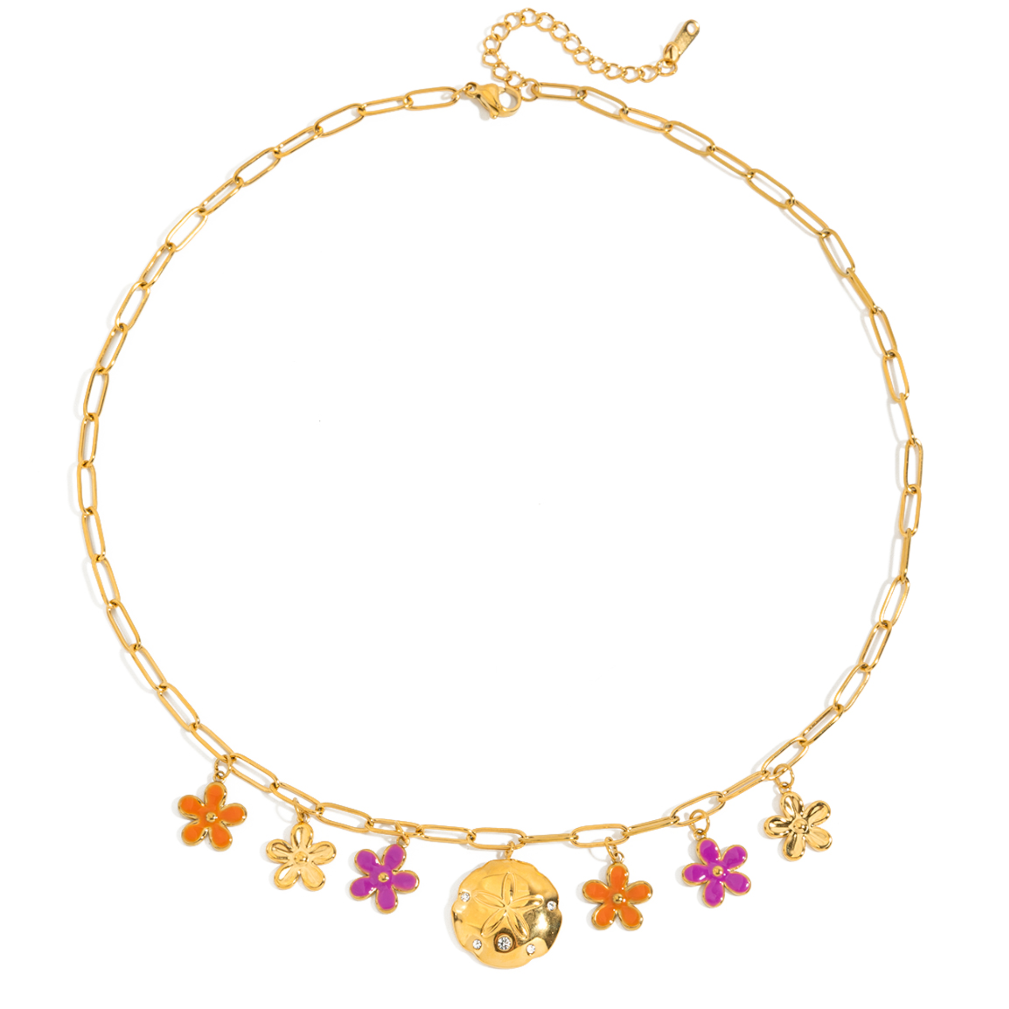 Ten naszyjnik to jak cichy spacer po ukwieconym ogrodzie o poranku. Delikatny łańcuszek ze stali szlachetnej pokrytej 18-karatowym złotem zdobi sześć uroczych kwiatuszków. Razem tworzą subtelną kompozycję, która zachwyca swoją lekkością i finezją.
