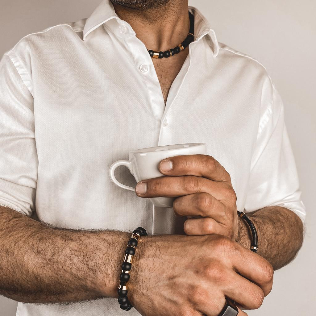 Efektowna bransoletka męska czarne, matowe kulki onyksu, oraz złote, wypolerowane na błysk stalowe charmsy tworzą duet doskonały.