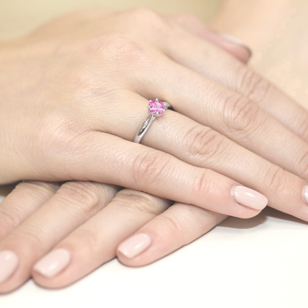 Czarujący, bardzo kobiecy, pierścionek wykonany został z najwyższej jakości białego złota próby 585 oraz jednego, centralnie usytuowanego różowego topazu o masie 0,60 ct, od którego subtelnie przechodzą na szynę pierścionka dwa kamienie szlachetne w szlifie brylantowym o łącznej masie 0,01 ct, czystości SI2 i barwie H.