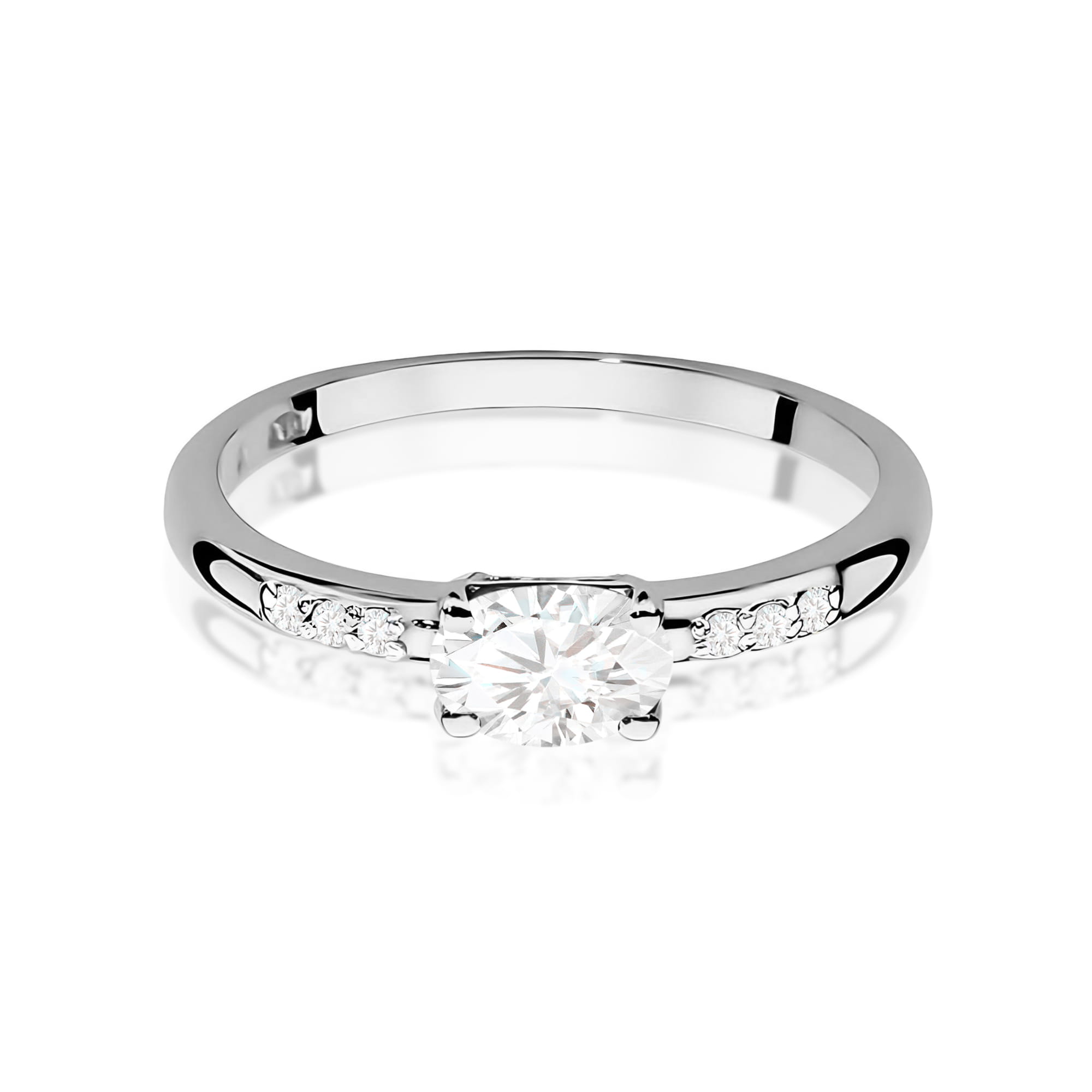 Zachwycający klasyczny pierścionek zaręczynowy wykonany z najwyższej jakości złota próby 585. Główny kamień – owalny diament laboratoryjny o wielkości 0,40 ct, czystości VS2 i barwie F – olśniewa swoim doskonałym blaskiem i klarownością. Jego piękno podkreślają subtelne, boczne diamenty laboratoryjne o łącznej masie 0,03 ct, które dodają kompozycji elegancji i finezji.