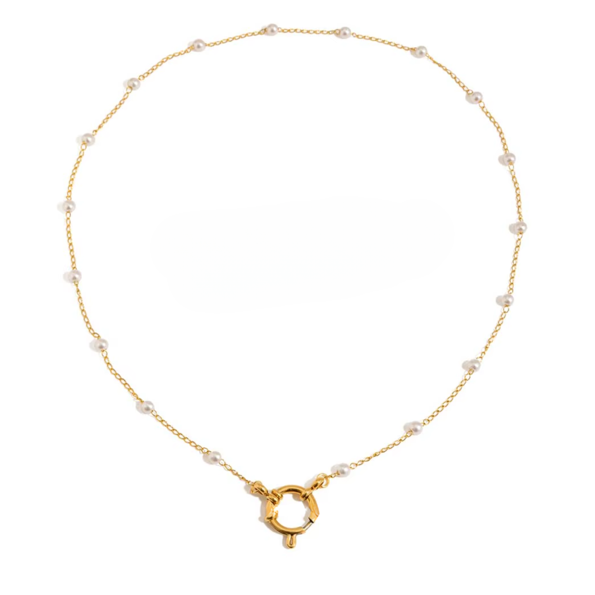 Ten elegancki naszyjnik zachwyca swoją minimalistyczną formą. Wykonany ze stali szlachetnej pokrytej 18-karatowym złotem, ozdobiony został perełkami syntetycznymi.