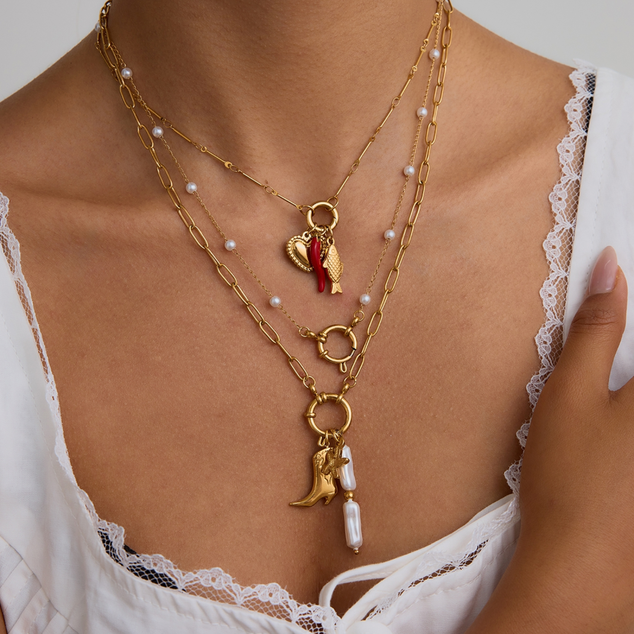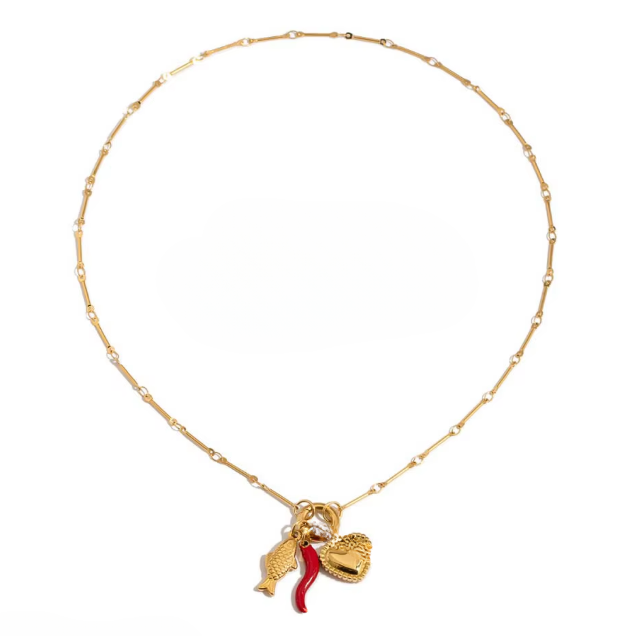 Ten naszyjnik to coś więcej niż ozdoba – to urokliwa opowieść zamknięta w trzech zawieszkach. Wykonany ze stali szlachetnej pokrytej 18k złotem, przyciąga spojrzenia niebanalnym połączeniem symboli: złotej rybki (na szczęście), papryczki chili (dla odrobiny pikanterii) oraz serca (bo miłość zawsze gra pierwsze skrzypce).