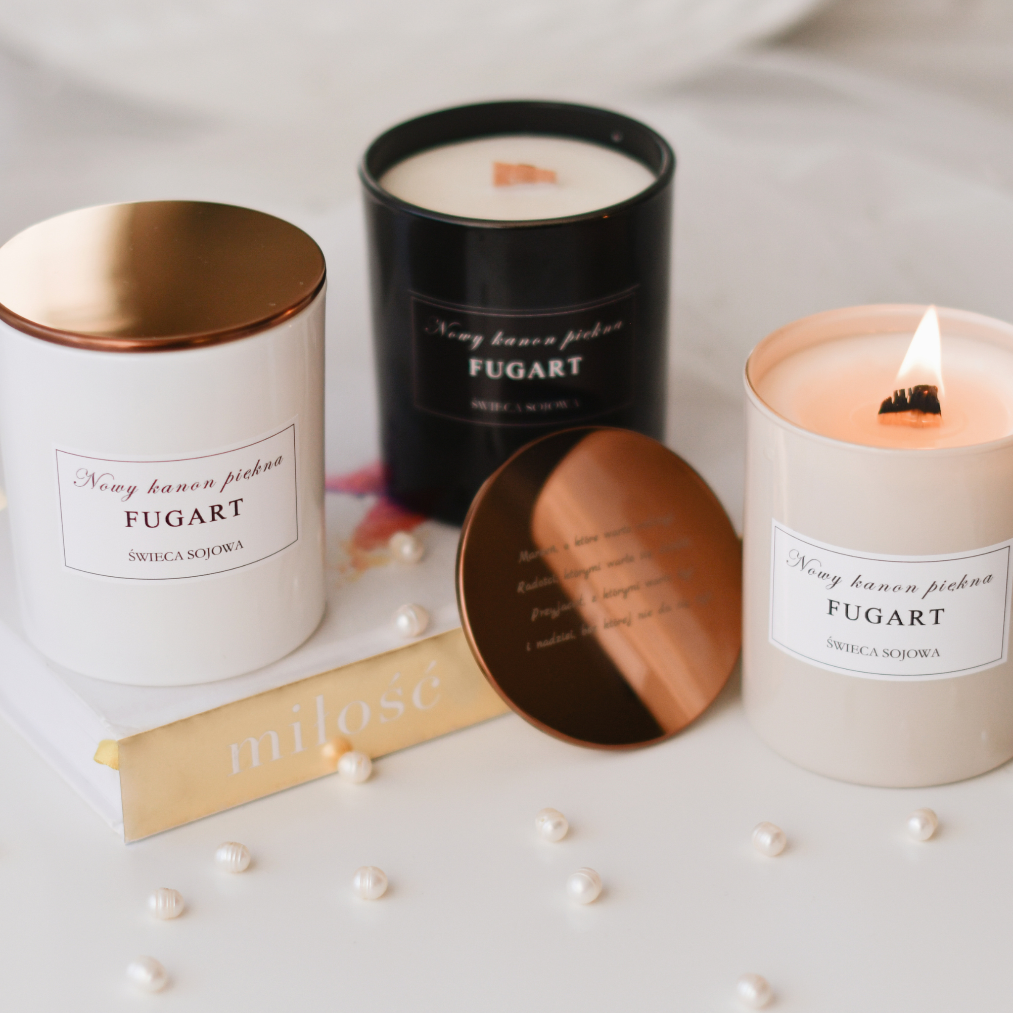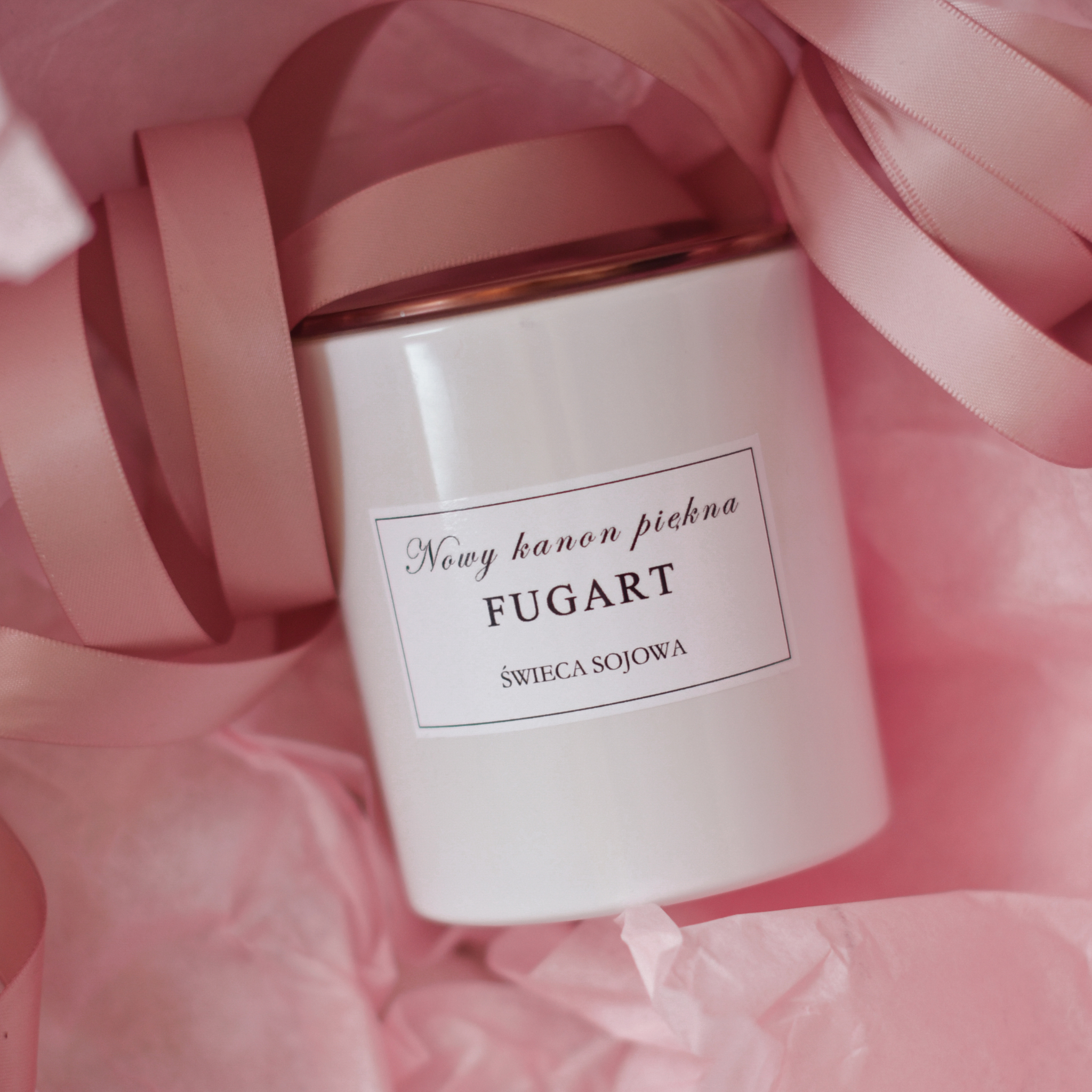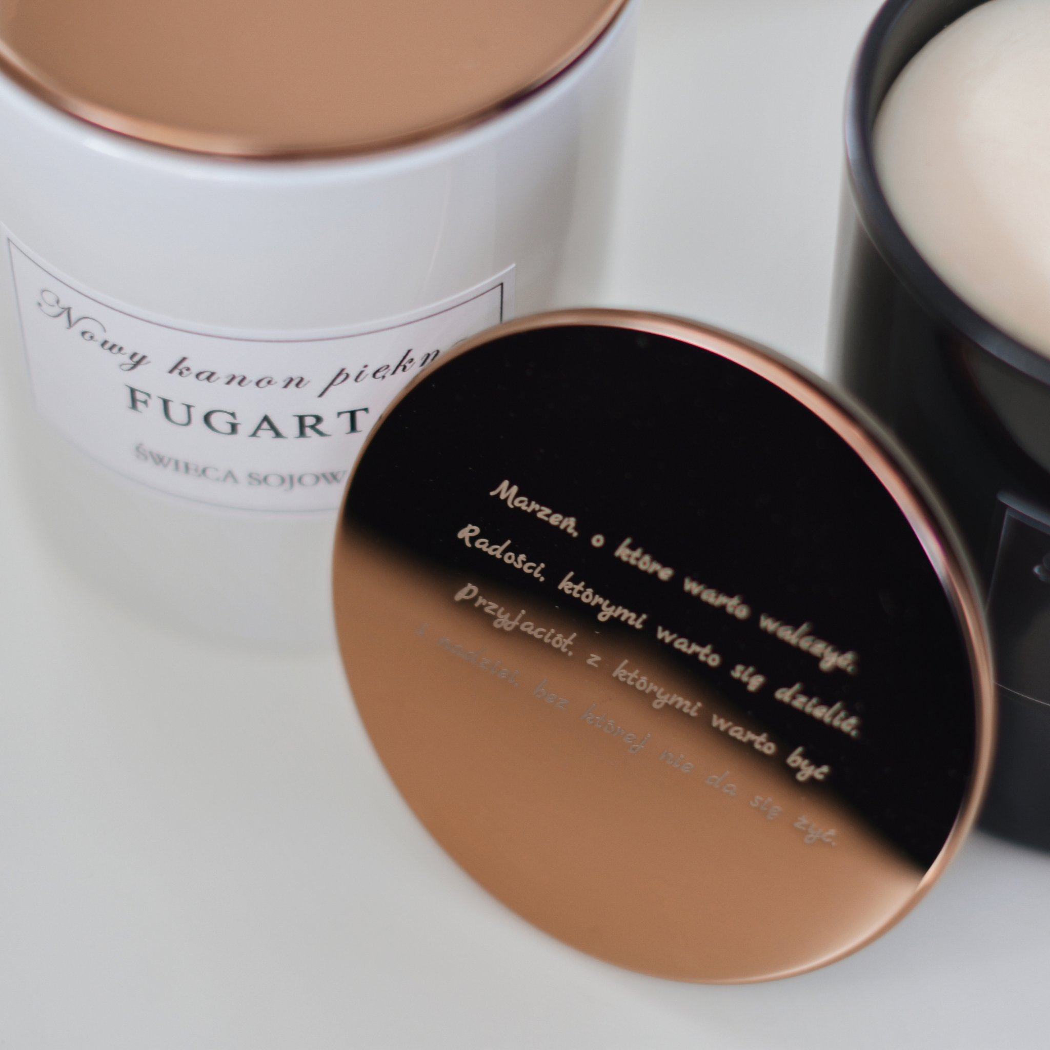 Biały błyszczący pojemnik nada elegancji Twojemu wnętrzu. Świece posiadają metalowe wieczko w kolorze różowego złota.