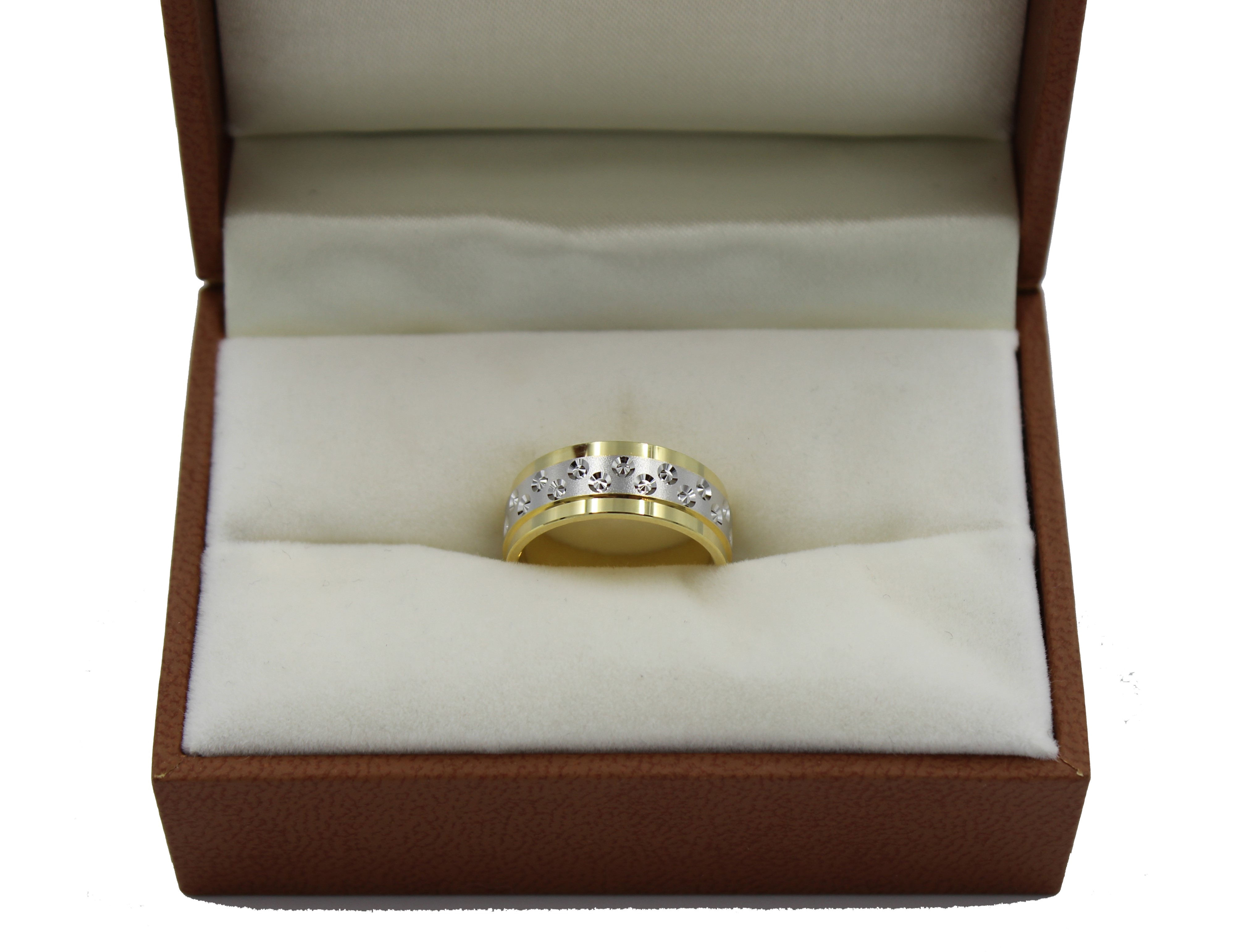 Fantazyjne obrączki ślubne, wykonane z dwukolorowego złota o szerokości 7,5 mm.