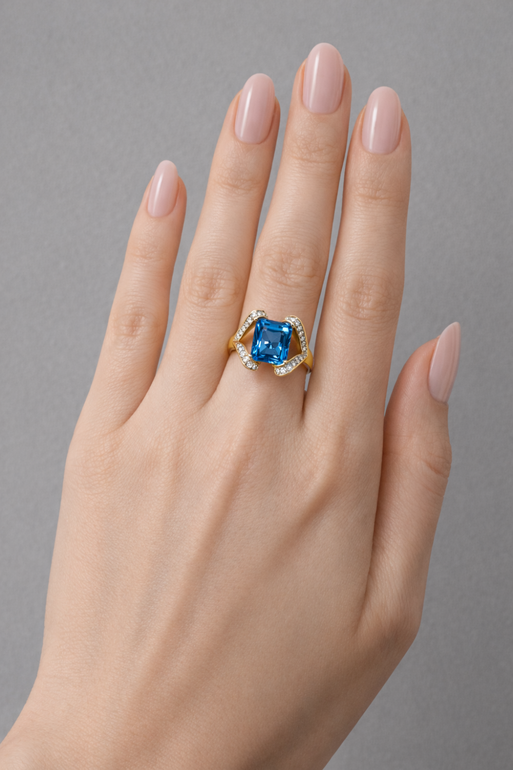 Ten wyjątkowy pierścionek wykonany ze złota próby 585 zachwyca harmonijnym połączeniem klasyki i nowoczesnego designu. Centralnym elementem kompozycji jest okazały, prostokątny kamień w intensywnym niebieskim odcieniu, który pięknie odbija światło i nadaje biżuterii wyrazistego charakteru.